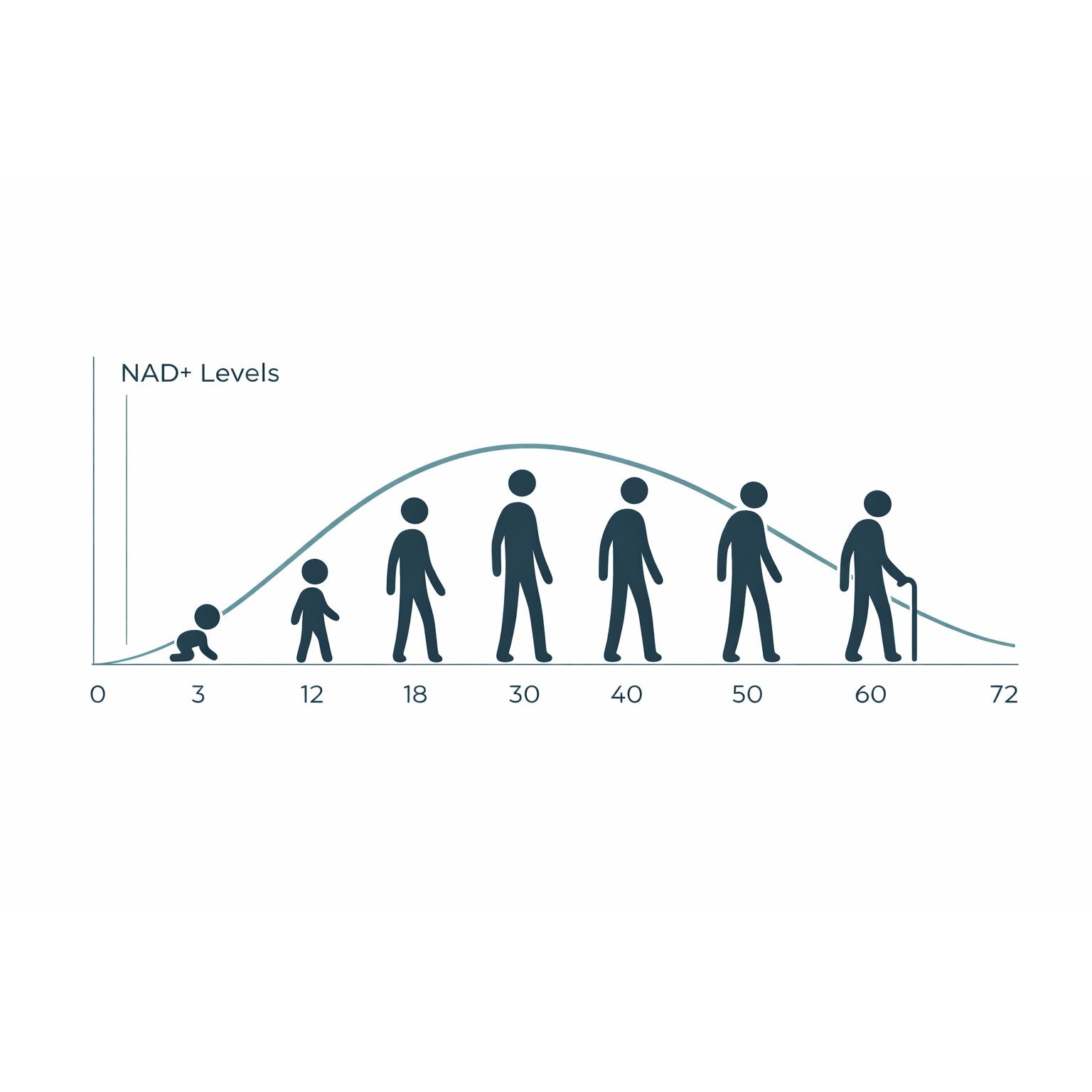 NAD⁺ är ett koenzym som finns i alla celler. Det är viktigt för energimetabolism, DNA-reparation, cellförnyelse och aktivering av sirtuiner – proteiner kopplade till livslängd. När vi åldras minskar NAD⁺-nivåerna naturligt, vilket påverkar energi och hälsa.